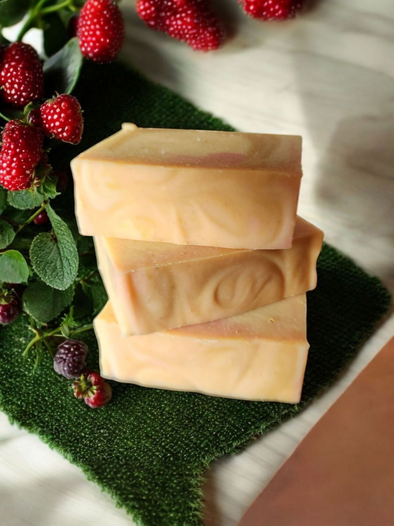 Nourishing ingredients: Coconut Oil, Sunflower Oil, Shea Butter, Cocoa Butter, Mango Butter, Castor Oil, Rice Bran Oil, Raw Goat Milk, Sodium Hydroxide, Hemp Seed Oil, Wheat Grass Powder.